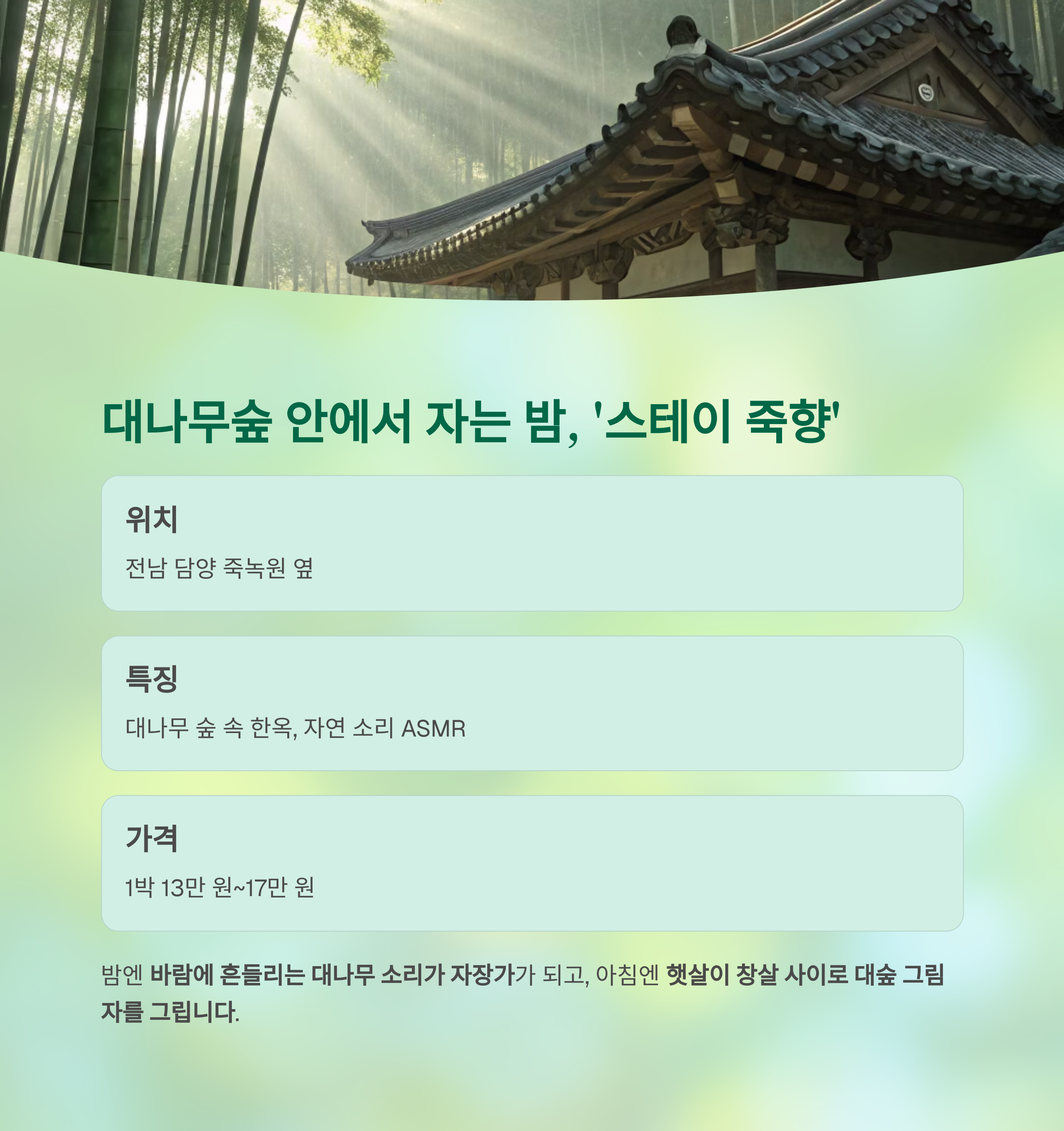 • 💡 특징: 대나무 숲 속 한옥, 자연 소리 ASMR