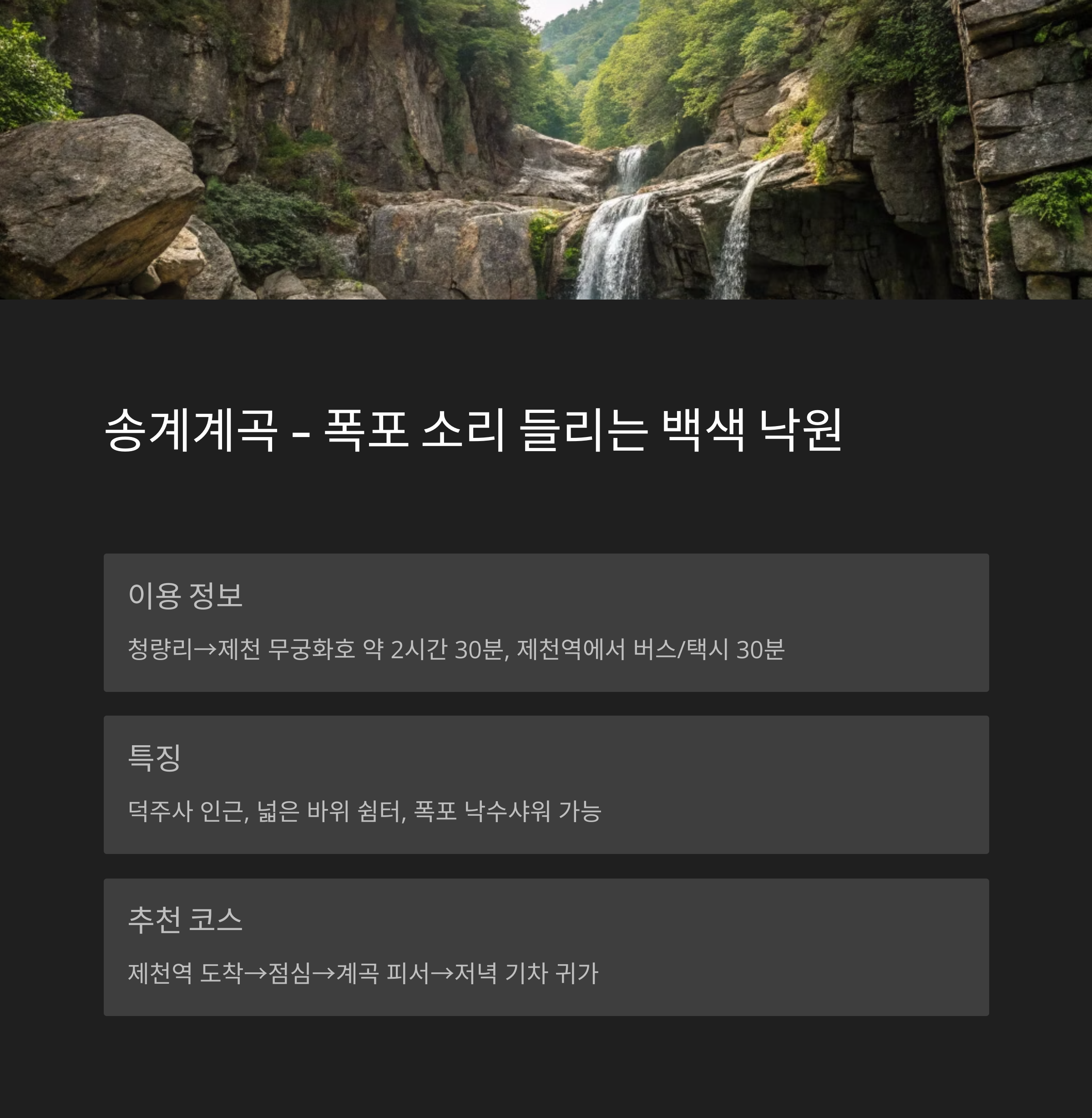 ② 충북 제천역 → 송계계곡 – 폭포 소리 들리는 백색 낙원