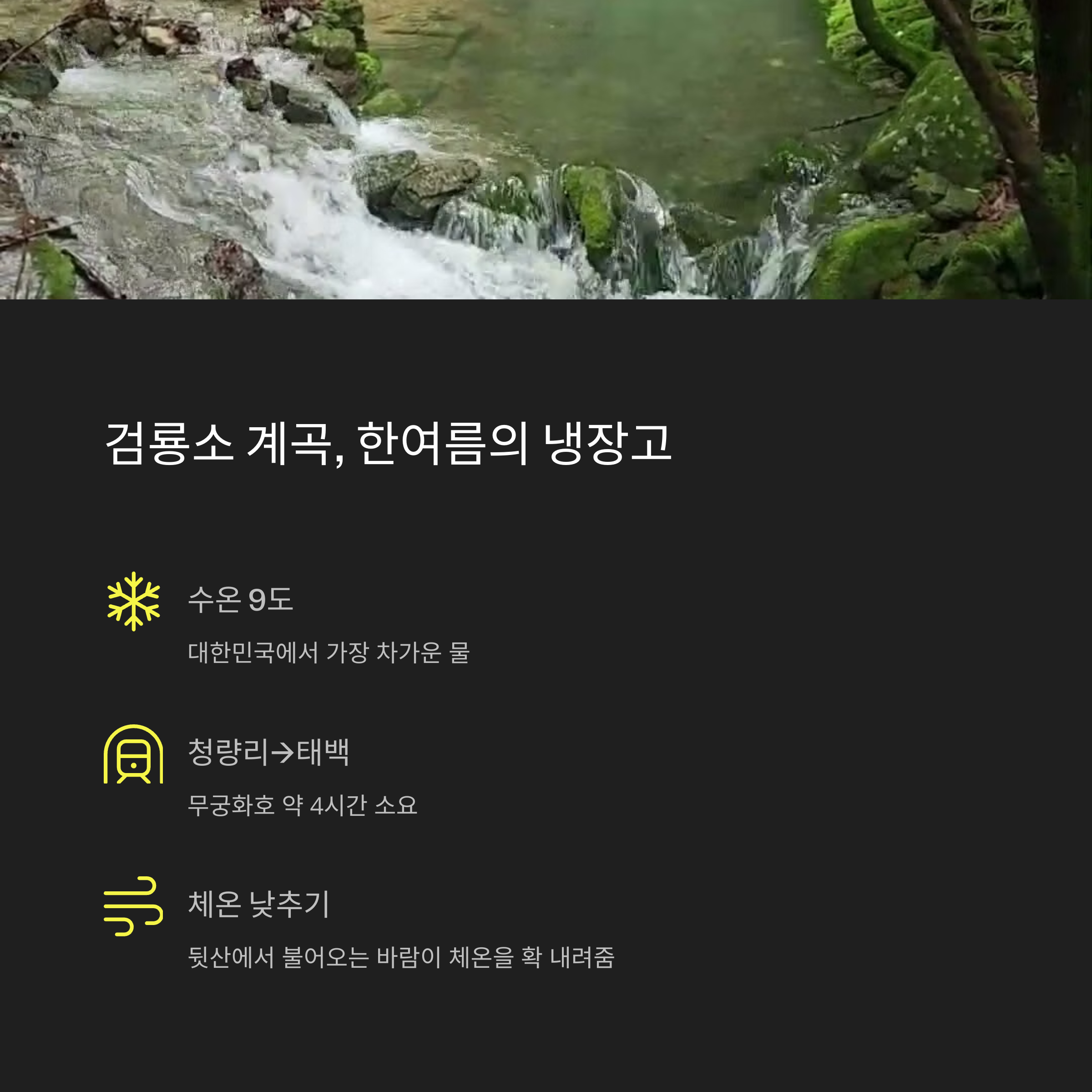 - 💦 계곡명: 검룡소 계곡 (태백역 → 검룡소 입구까지 택시 20분)