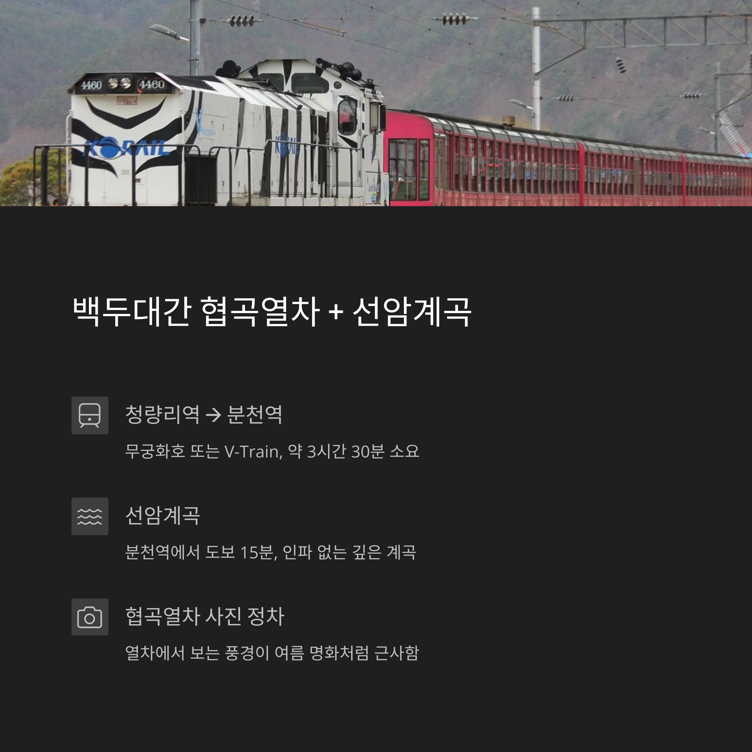 - 🚉 이용열차: 무궁화호 or V-Train (협곡열차)