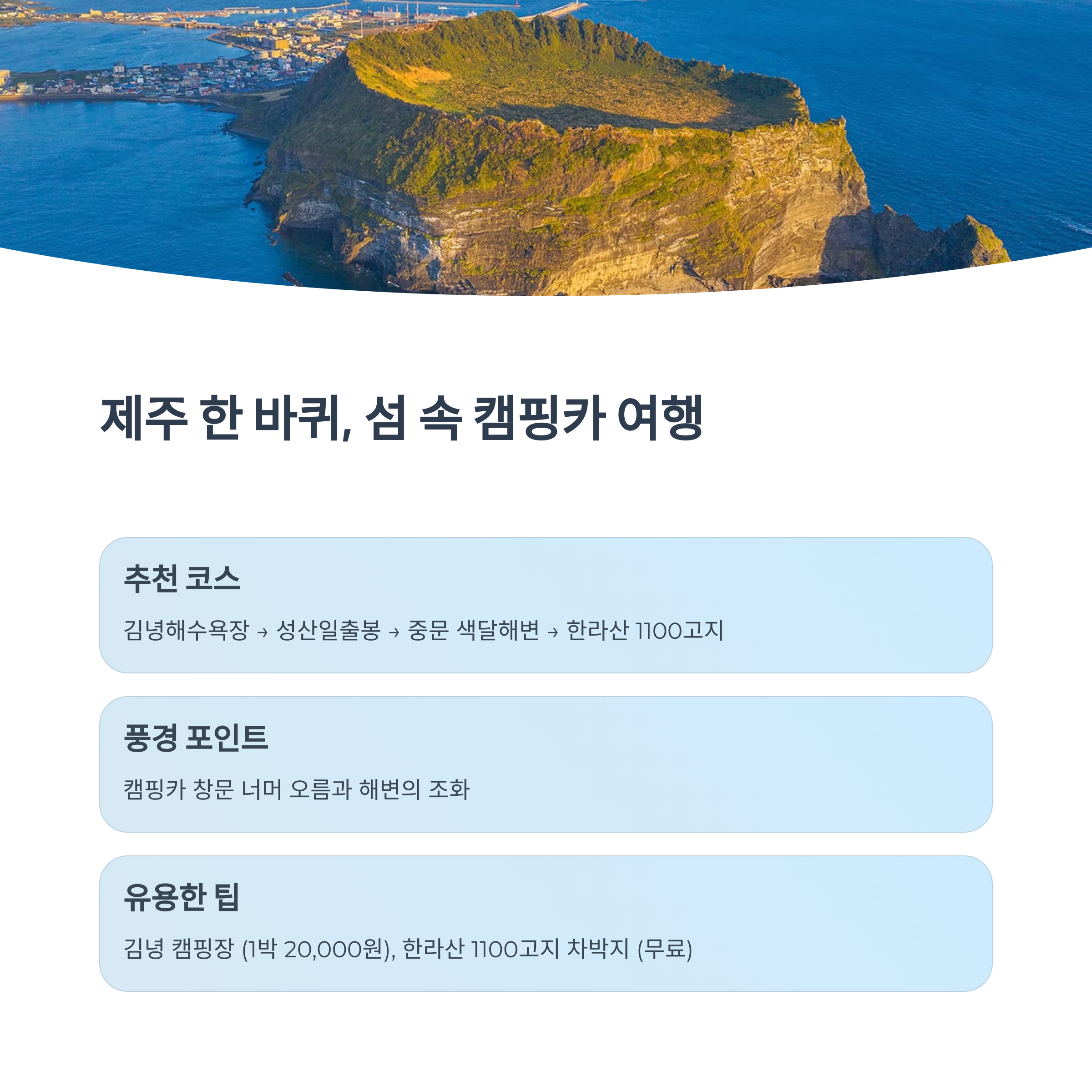 - 추천 경로: 김녕해수욕장 → 성산일출봉 → 중문 → 한라산 1100 고지